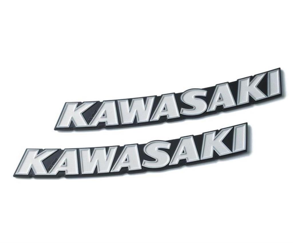 Two classic white "KAWASAKI" emblems as a replacement for the standard Kawasaki emblems.