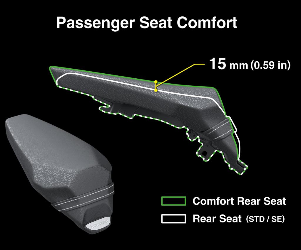 Rear seat that is longer and 15mm higher for improved passenger comfort on longer journeys. With aluminium Kawasaki logo.